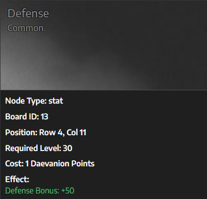 Daevanion Nodes: Defense is a stat node you can unlock on the Daevanion board. For example, the Defense node at Row 4, Column 11 requires level 30 and costs 1 Daevanion Point. Activating it gives a +50 bonus to your defense.