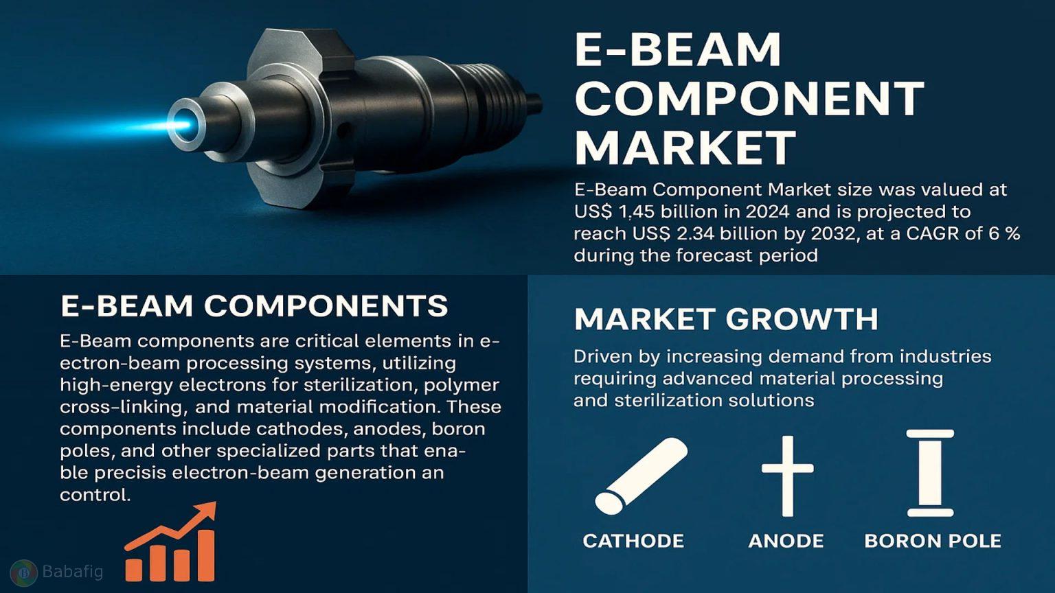 Global E-Beam Component Market was valued at USD 1.45 billion in 2026 and is projected to reach approximately USD 2.34 billion by 2034, registering a CAGR of 6.2% during the forecast period 2026–2034. Market expansion is supported by rising adoption of electron-beam processing across sterilization, polymer modification, and precision manufacturing, indicating steady medium-term growth.