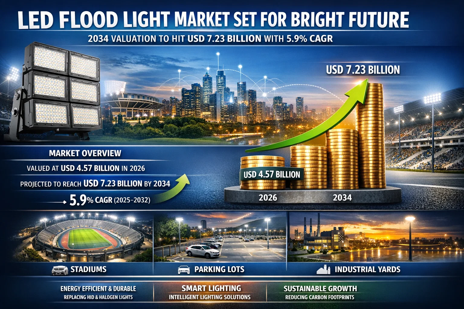 global LED Flood Light market, valued at USD 4.57 billion in 2026, is projected to reach USD 7.23 billion by 2034. This growth is underpinned by a 5.9% CAGR (2025–2032), driven by a worldwide shift toward high-intensity, energy-efficient outdoor illumination and the rapid integration of "smart" urban infrastructure.